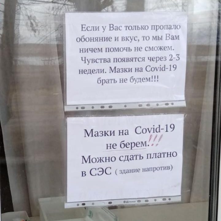 Напомним, наши подписчики и телезрители отправили нам фотографии с объявлениями, размещёнными на районной больнице. В них говорится, дословно «если у Вас пропало обоняние и вкус, то мы Вам ничем помочь не сможем».  Кроме того, в объявлении написано, что анализы на COVID-19 в больнице не берут, и предлагается делать их платно.